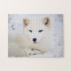Foto eines niedlichen weißen arktischen Fuchs, der im Schnee ruht. Das Tier hat weiße Felle und braune Augen und sieht dich an. Ein echter Diva!