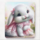 Ein niedliches, flauschiges, weißes Hasen mit einem zarten, rosa Spitzen-Kleid sitzt in einem traumhaften, blumigen Ambiente