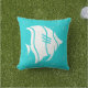 Weißer Sonnenfisch auf einer Seite auf Blue PILLOW und weißer Streifen auf der Rückseite. Design von Sandy Closs. Teil der Kopfkissendekoration zum Thema Ozean. Design von Sandy Closs"