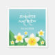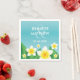 Tropische Hochzeitsnapkins mit Desteis illustrierten, weißen und gelben Frangipani-Plumeria-Blume mit grünen Blätter. Es gibt personalisierbare Textbereiche für die Namen des Ehepaares, das heiraten will, und für das Datum der Hochzeit. Die Hintergrundfarbe ist schön blau.