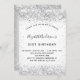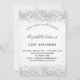 Eine Einladung für eine elegante 21. Geburtstagsfeier (oder jedes Alter). Ein schick weißer Hintergrund auf der Vorderseite. Dekoriert mit Imitaten silbernen Glitzer. Personalisieren und fügen Sie einen Namen und Party-Details hinzu. Der Name wird mit einem handgeschriebenen Stilskript geschrieben. Zurück: Imitate silber aussehender Hintergrund mit Glitzern.
