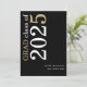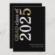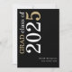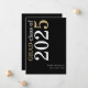 White Gold Text 2025 Black Abschluss Ankündigung. Ein modernes, stylisches typografisches Design, um die Neuigkeiten Ihres Absolventen zu verkünden. Stilvolle große Typografie rotiert und auf der links Seite oben in Weiß und Gold auf klassischem schwarzen Hintergrund. Personalisieren Sie die Erholung des Textes einfach, indem Sie Ihre Nachricht auf der Rückseite einschließen