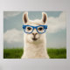 Weißer Lama mit Blauer Brille - Niedliches und trendy Animal Foto. Schöne weiße Lama mit stilvollen blauen Gläsern. Dieses charmante Bild zeigt die spielerische Persönlichkeit des Lamas und sein einzigartiges Aussehen.