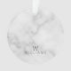 Fügen Sie Ihrem Weihnachtsbaum eine Touch von einzigartigem Stil mit diesem eleganten, weißen Marmor-Muster Acryl-Zierpflanzen mit Monogramm und Namen in grau modernen Sans serif Schriftart Stil auf weißem Marmor.