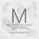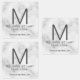 Moderne Monogram Business Labels mit Geschäftsdetails in grauem, modernem Sans Serif Schriftart auf weißem Marmorhintergrund.