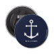 Moderner Minimalistischer Nautical Button Bottle Opener mit weißem Anker mit personalisiertem Namen in weißem, modernen Sans Serif Schriftart Stil auf marineblau Hintergrund. Perfekt als Geschenk für Papa, Trauzeugen, Familiengeschenk und mehr.......................................................................................................................................................................................