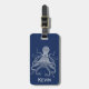 Dunkelblaue Gepäckmarke mit Grafik eines weißen Oktopus, vorne und rechts, vorne und hinten.