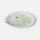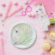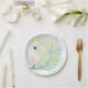 Weißer Papageienkakadu in palmenfarbenen Blätter. Pappteller