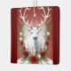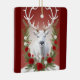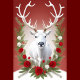 Eine beeindruckende Abbildung eines weißen Rentiers, majestätisch in der Mitte platziert. Seine großen Geweihe verbreiten sich, mit einer festlichen Anordnung von rote Rosen und weißen Blume geschmückt, wodurch ein lebhafter Kontrast zu einem tiefen roten Hintergrund entsteht.