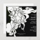 Schwarzweiss-Geburtstagseinladung mit schwarzem Hintergrund und ein weißer Ritter auf seinem Pferd mit der Lanze bereit zu schlagen. Kundengerechter Text im Weiß