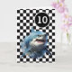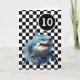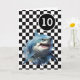 Eine Hai-10. Geburtstagskarte für Jungen. Mit einem schwarz-weiß karierten Hintergrund auf der Vorderseite mit einem Platz können Sie das Alter bei Bedarf leicht personalisieren. Die Geburtstagskarte dieses Kindes wird Hai-Fans begeistern!