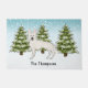 Desteis originelle Cartoon-Illustration eines niedlichen Weißschweizer Hirten / Weißfarben Deutscher Schäferhund. Der Hund ist in einer Winterlandschaft mit drei grünen Tannenbäumen und fallendem Schnee untergebracht. Der Hintergrund ist ein blaues bis weißes Gefälle, das das Design des kalten Wintertages verleiht. Es gibt auch einen personalisierbaren Textbereich für einen Namen.