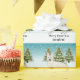 Desteis originelle Cartoon-Illustration eines niedlichen Weißschweizer Hirten / Weißfarben Deutscher Schäferhund. Der Hund befindet sich in einer Winterlandschaft mit drei grünen Tannenbäumen. Der Hintergrund ist ein blaues bis weißes Gefälle, das das Design des kalten Wintertages verleiht. Es gibt einen personalisierbaren Textbereich, der jetzt lautet: "Frohe Weihnachten!" zusammen mit einem individuelle Name.