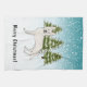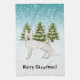 Desteis originelle Cartoon-Illustration eines niedlichen Weißschweizer Hirten / Weißfarben Deutscher Schäferhund. Der Hund ist in einer Winterlandschaft mit drei grünen Tannenbäumen und fallendem Schnee untergebracht. Der Hintergrund ist ein blaues bis weißes Gefälle, das das Design des kalten Wintertages verleiht. Es gibt auch einen personalisierbaren Textbereich, der jetzt lautet: "Frohe Weihnachten!".