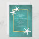 Weißer Seestern auf aquamarinem Grunge Papier Moderne Beachhochzeitsfeier oder laden mit einem Goldrahmen auf dunkelblauem Hintergrund und weißen Seestern an den Ecken ein. Dieses elegante Hochzeitsdesign ist Teil eines Set oder einer Hochzeitskollektion und ist ein absolut individualisierbares Template für eine Sommerhochzeit am Strand.