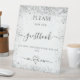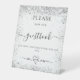 Ein schick weißer Hintergrund, mit Imitaten verziert, silberne Glitzer Glitzern. Mit dem Text: Bitte unterschreiben Sie unser Gästebuch. Ein Tafelschild, auf dem die Gäste zur Unterschrift gefragt werden, und Ihr Gästebuch.