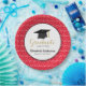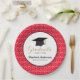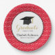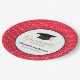 Diese Abschluss-Papierplatte (Einwegplatte) zeigt eine Grafik eines Abschluss-Hutes (Mörtel) und eine anpassbare Textdatei für: Klasse, Absolventenname, Name der Schule. Diese Papierplatte ist mit einem weißen, wirbelfarbenen Muster auf einem roten Hintergrund hervorgehoben.