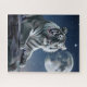 Weiße Tigerpuzzle ein Geschenk für große Katzen Liebhaber. Der weiße Tiger sitzt mit dem Puzzle des Mondjigsaw. Schwarz-Weiß-Tigerpuzzle