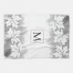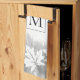 Modernes, weißes Ahornblatt graue Aquarellwäsche und ein monogramm Küchentuch mit einem Rand von weißen Ahornblättern auf grauem Aquarellspülen und Ihrem Monogramm in einem Rahmen mit Kontur in der Mitte.