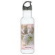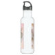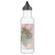 Wasserflasche mit einem Foto mit einem Apfelzweig mit seinen schönen weißen Apfelblüten.