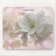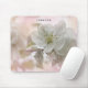 Ein Mauskissen mit einem Foto mit einem Apfelzweig, auf dem die schönen weißen Apfelblüten zu sehen sind.