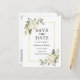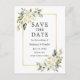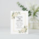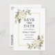 Wasserfarbe Elfenbeinweiße Blumengrün Hochzeit Verlobung Ankündigung Save the Date Postcard beinhaltet Elfenbein cremefarbene Rosen und botanische Vegetation. Goldrahmen