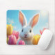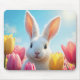Ein flauschiges weißes Kaninchen mit großen Ohren ist von farbenfrohen Tulpen umgeben, die unter einem hellen, sonnigen Himmel liegen