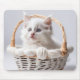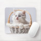 Niedliches weißes Kätzchen in einem Korbkorb, abgeschieden auf einem weichen Graustufengrauen Hintergrund