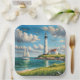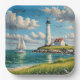 Segelboot, das an einem weißen Leuchtturm mit Möwen vorbeisegelt