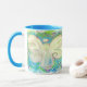 Malerei eines Engels im Weiß mit weichem Wirbel der Farbe. Der Engel schwimmt über einen ruhigen Hintergrund des Seeschaumgrüns und weich -BLAUS.