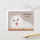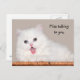 Niedliches, weißes persisches Kätzchen mit offenem Mund, als ob das Sprechen fehlte, um den Empfänger dieser Postkartenspass für Katzenliebhaber zu sprechen