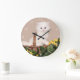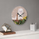Weiße persische Kätzchen in einem Korbkorb mit Blume, die ihre Weltkatzenliebhaber um die Wanduhr umkreisen. Hintergrund ist beige, Zahlen können entfernt werden