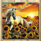 Weiße Pferde in Sonnenblumen Poster. Schöne Illustration eines weißen Pferdes, das auf einer Wiese von Sonnenblumen läuft, wenn die Sonne aufgeht oder Sets.