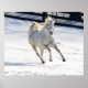 Ein geiles weißes Pferd, das in einer schneebedeckten Weide herumgaloppiert.