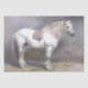 Dieses Design ist für Pferdefreunde gedacht - Vintage französische Kunstwerke eines weißen Pferdes mit Trägermaterial und Decken in einem Stall mit Steinmauer und Heuschrecken zu seinen Füßen.