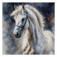 Ein weißes Pferd mit detailreicher Aquarellfarbe mit ausdrucksvollen Augen wird vor einem weichen, verschwommenen Hintergrund dargestellt. Die natürlichen Farben verstärken das lebensechte Aussehen.