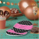 Schwarz-Weiß-Polka-Punktmuster. Weiße Polka-Punkte auf schwarz mit heißen rosa Brautparty-Papier-Tellern.