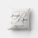 Personalisiertes Grau, mit Monogramm Schwarzweiss-Kissen mit Braut- und Bräutigamnamen und Hochzeitsdatum in einer Skript-Schriftartüberlagerung entwerfen auf einem weißen Hintergrund. Elke Clarke© für MonogramGallery bei Zazzle. Macht ein großes Geschenk für eben weds. Großer trendy, eleganter Zusatz für Ihr Schlafzimmer, Lieblingsstuhl, als Spaß-Wohngestaltung in Ihrem Familienraum oder formaler dekorativer Zusatz zu Ihrem Wohnzimmer. Fertigen Sie mit Ihren Namen, Monogramminitiale und Hochzeitsdatum besonders an.