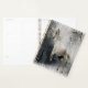 Weißes Pferd auf rustikaler Holzstruktur im schneebedeckten Winterwald.