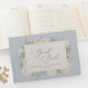 Weißfarbene Blume, hellblaues Gästebuch