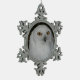 Für Eule-Sammler! Zinnschneeflocken Weihnachtsschmuck, das das Foto eines weißen Schneeauuls zeigt.