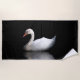 Weißer Schwan in einem See schwebend mit Reflexion im Wasser vor schwarzem Hintergrund