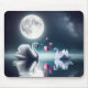 Eine ruhige Seeszene zeigt einen echten Schwan und einen Origami-Schwan, der sich unter einem leuchtenden Vollmond gegenübersieht, wobei zwischen ihnen leuchtende rosa Herzen schweben