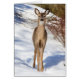Ein nah aufgestelltes Bild eines in einem schneebedeckten Feld stehenden Weißen, das den Betrachter anstarrt.