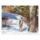 Ein weißes Hirsch steht in einem schneebedeckten Feld und starrt den Betrachter an.