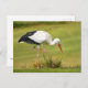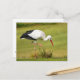 Weißstorch (Ciconia ciconia), stehend auf Gras, ein erhöhtes Bein, auf der Suche nach Nahrung in der Nähe des Teiches