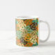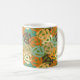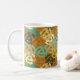 Diese Tasse hat ein modernes Design eines Plattenadapters, der sich in Bräunen, Gelb, Braun, Orange, Türkis, Blau und Grün überlagert.