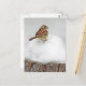 Ein Spatzen mit weißem Kehlkopf sitzt auf einem Schneeband, der eine Baumstupp bedeckt.