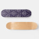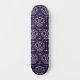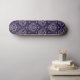 Dieses Bild ist ein nahtloses, sich wiederholendes Muster mit fein detaillierten Zuckerschädeln, die in Weiß oder einer sehr hellen Farbe vor einem tiefen, dunklen, lila oder marineblauen Hintergrund gerendert werden. Die Schädel sind in waagerechten Reihen und vertikalen Spalten angeordnet, wodurch eine rasterähnliche Struktur für das Muster entsteht. Jeder Schädel ist sehr dekorativ, mit verzierten Mustern um Augen, Nase, Stirn und Wangen, einschließlich Wirbel, Punkten und Blumenmotiven.