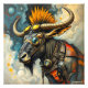 Ein fantastisches Geschöpf, das einem Büffel ähnelt, ist mit Steampunkaccessoires geschmückt, darunter eine Brille und eine aufwändige Rüstung. Die lebendige Mohawk und der dynamische Hintergrund der Kreatur schaffen eine skurrile und abenteuerliche Atmosphäre.